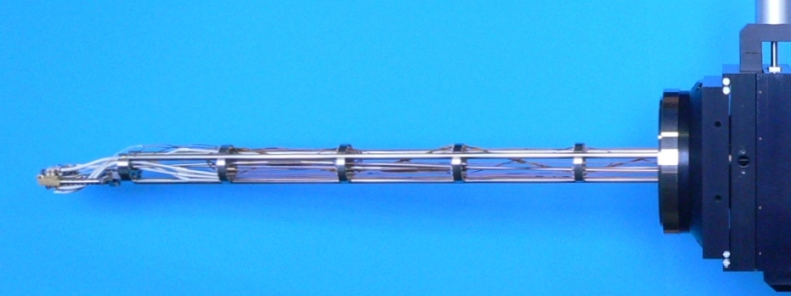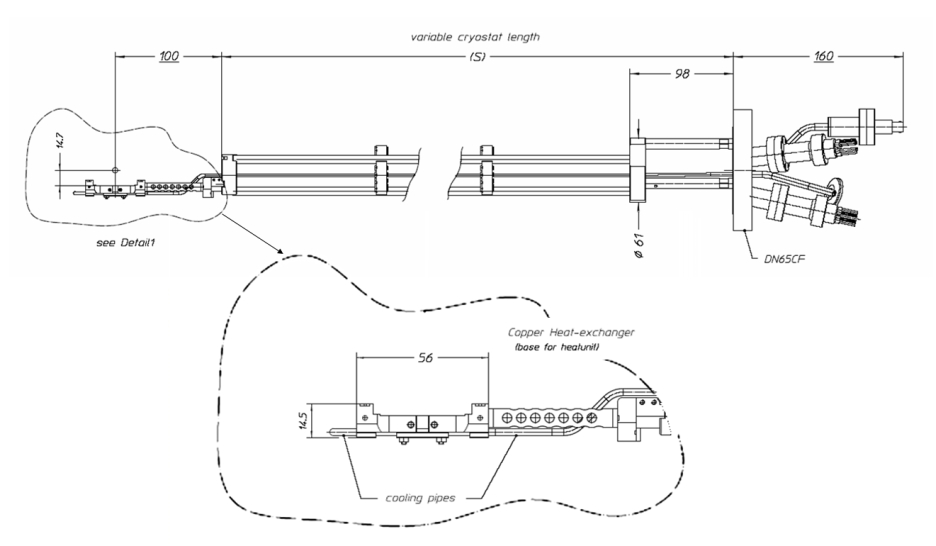Low-cost LN2 axial flow cryostat for applications where temperatures > 80 K are needed. The cryostat is composed by LN2 input and output steel tubes ending in a copper heat exchanger. The cryogenic transfer lines are supported by a rigid frame hosting also the electrical wiring. The compact design conjugates great versatility and fast cooling. |